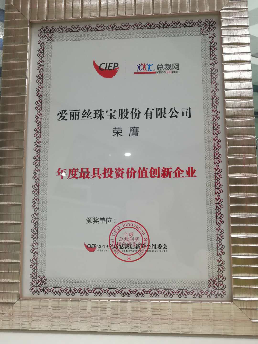 爱丽丝珠宝获奖证书