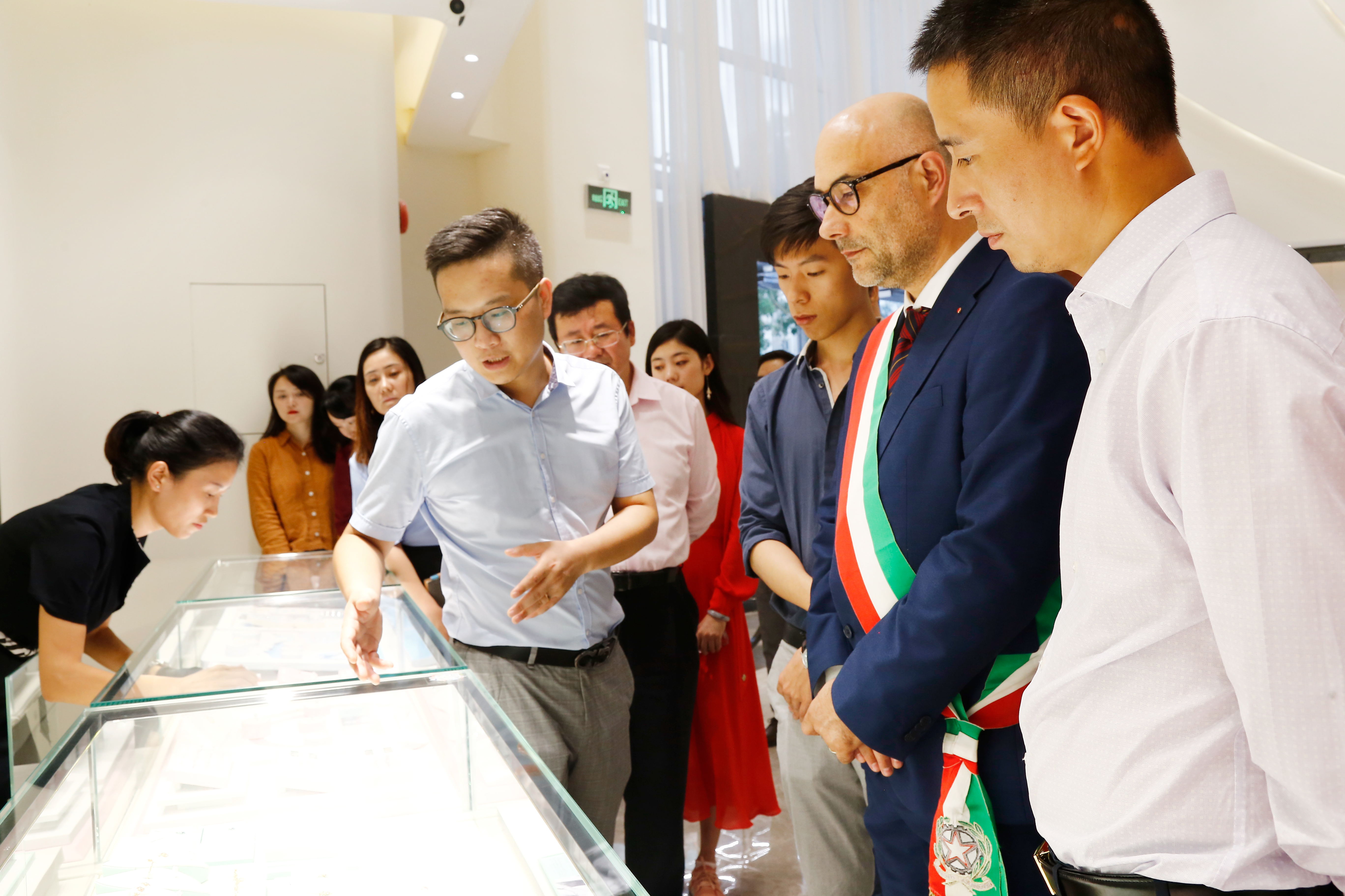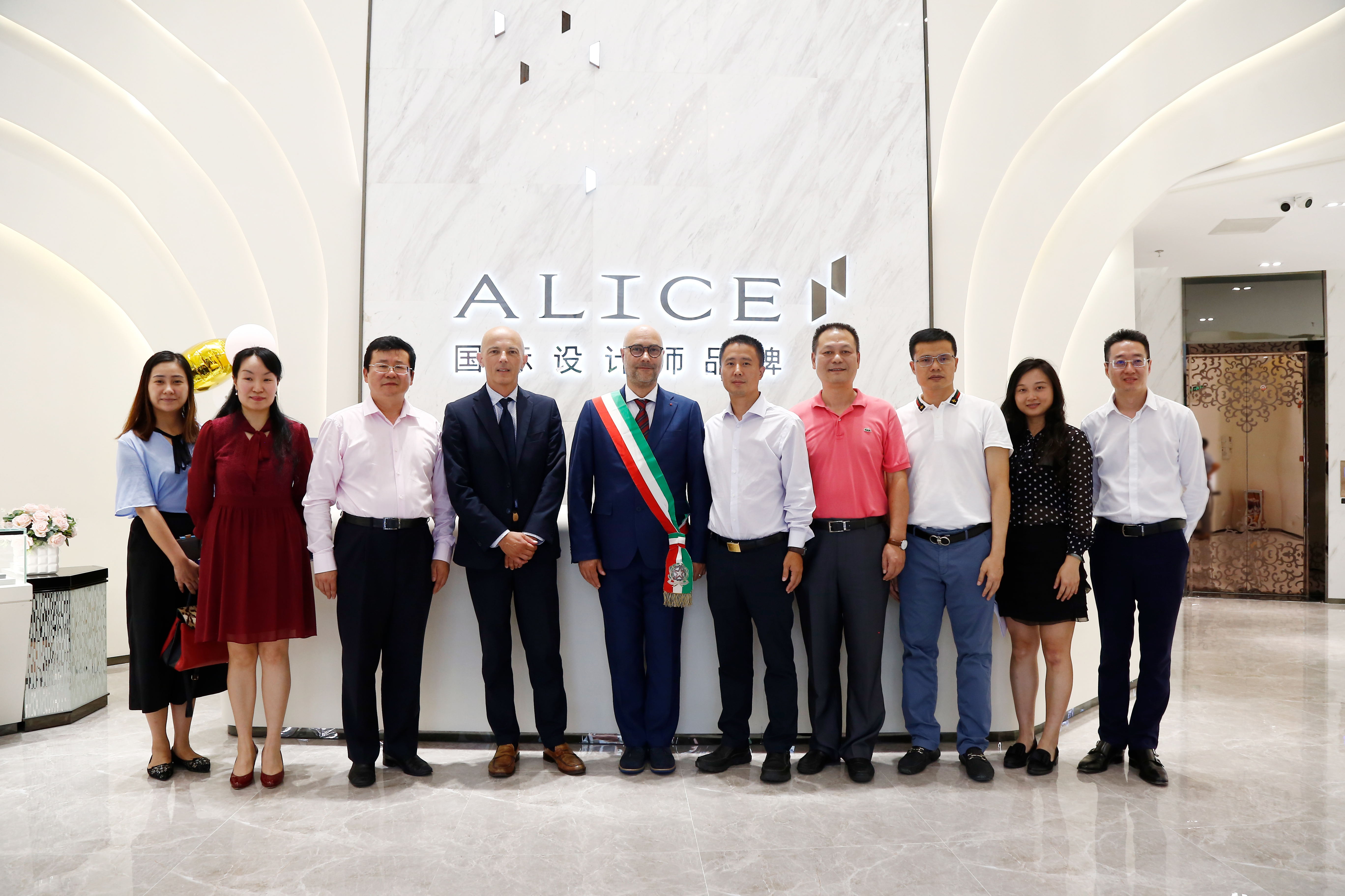 ▲莅临爱丽丝珠宝参观考察的领导嘉宾,意大利瓦伦扎市副市长BARBADORO MASSIMO(正中),意大利珠宝工业联合会副主席STELLA DIMITRI(左四),盐田区委常委、常务副区长时卫干同志(右五),中国黄金报社社长陶明浩(左三),爱丽丝珠宝董事长郑国阵先生(右三)