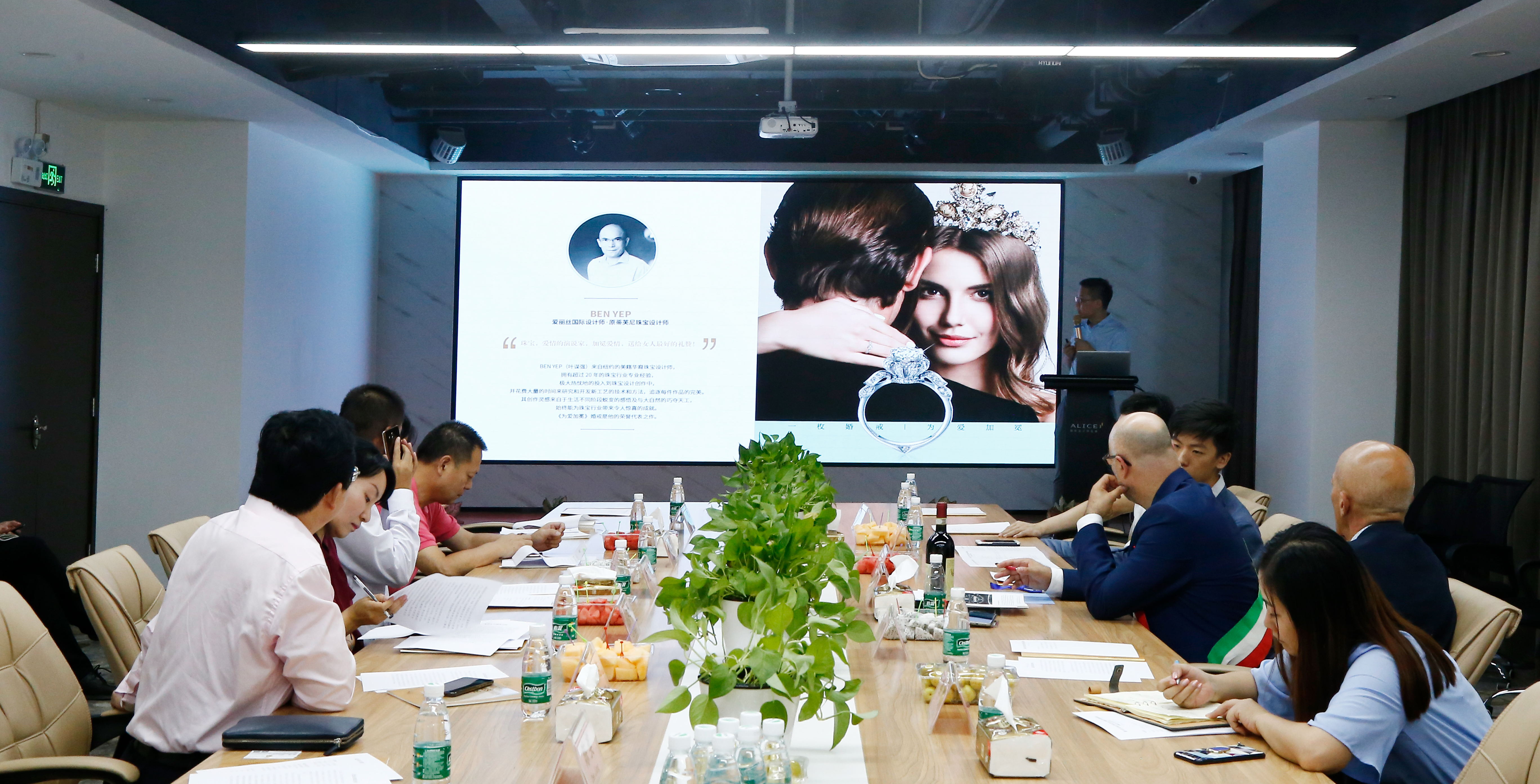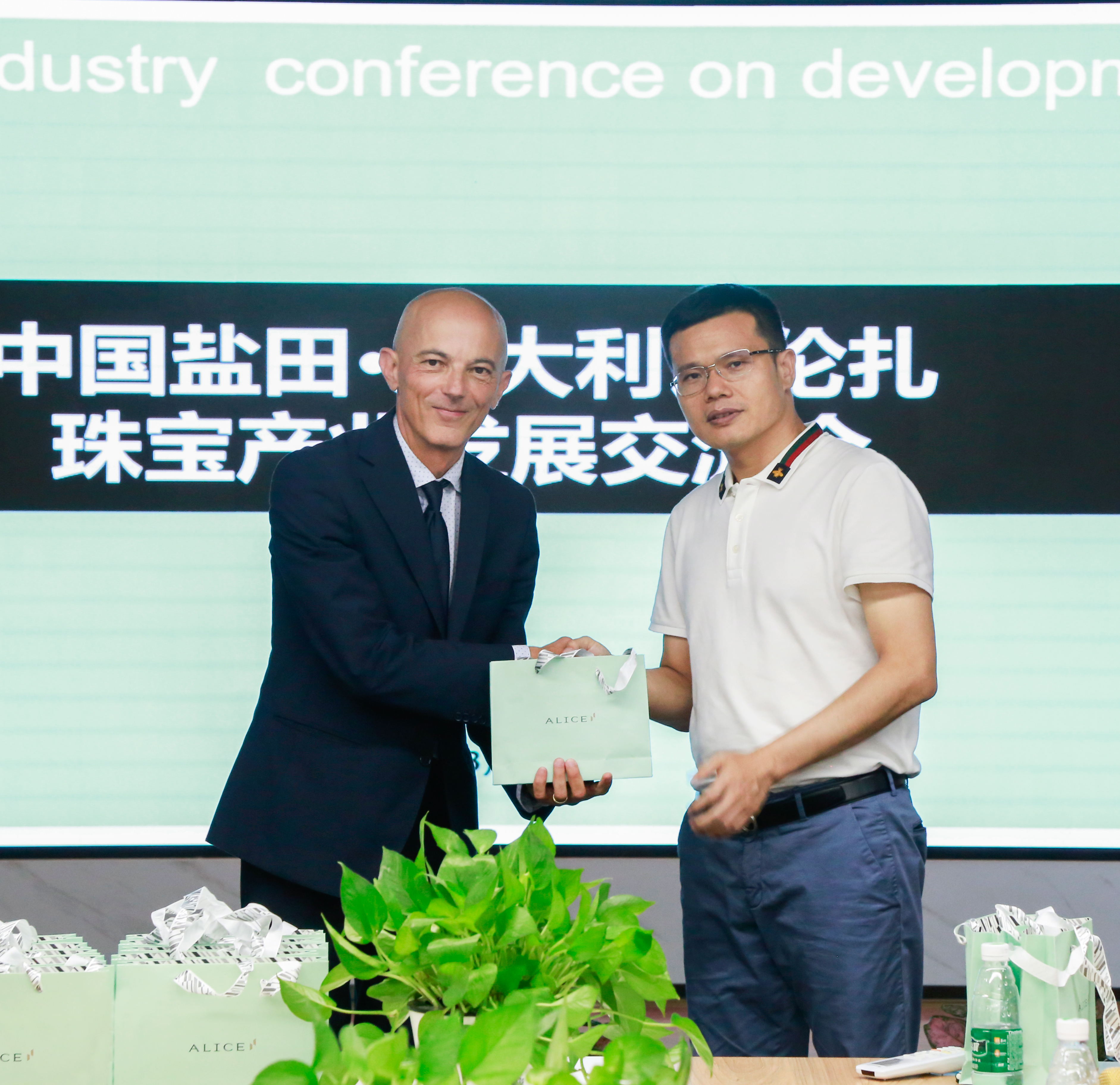 随后,在区委常委、常务副区长时卫干同志的介绍下,到访的领导与嘉宾一同观看了盐田营商环境推介宣传片,并就黄金珠宝等产业合作事项,进行了友好交流座谈。交流过程中,各方参与交流探讨和发言的环节均显示了极大的热情。在座谈进入尾声时,盐田区委常委、常务副区长时卫干同志、瓦伦扎市副市长BARBADORO MASSIMO以及爱丽丝珠宝董事长郑国阵,互赠纪念品并亲切合影留念。