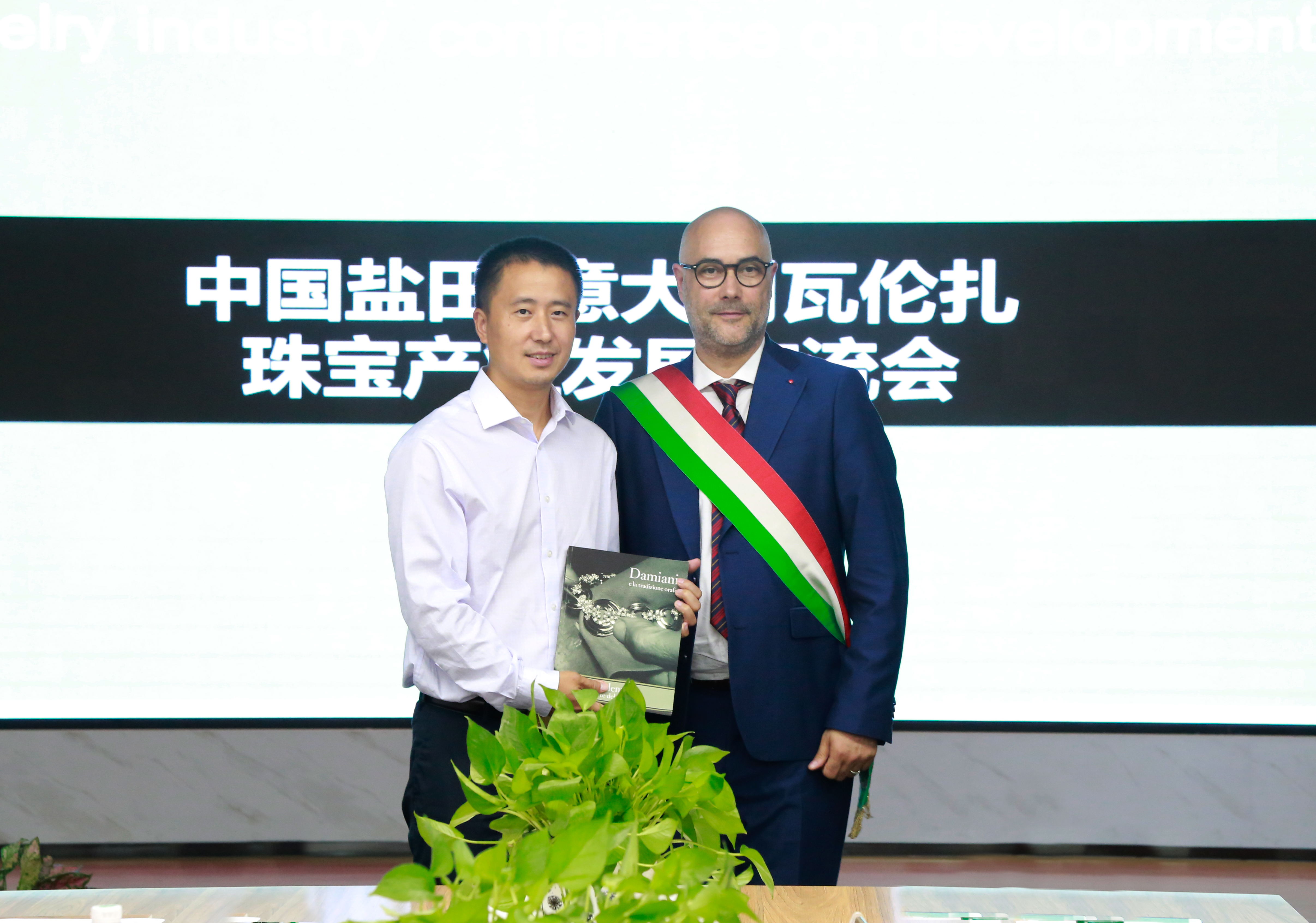 ▲瓦伦扎市副市长BARBADORO MASSIMO向盐田区委常委、常务副区长时卫干同志赠送珠宝纪念书一册