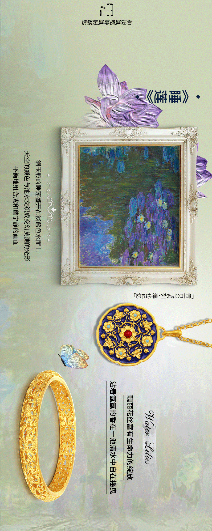 莫奈热衷于描绘大自然的景象将纯美的大自然和淳朴的生活作为创作的灵感题材用色彩和笔触凝固时间和空间把那些转瞬即逝的美好凝固在画里画笔下流动的色彩与变幻的光影点燃了艺术黄金珠宝设计师的艺术灵魂用奇思妙想赋予了黄金珠宝璀璨而神秘的光芒