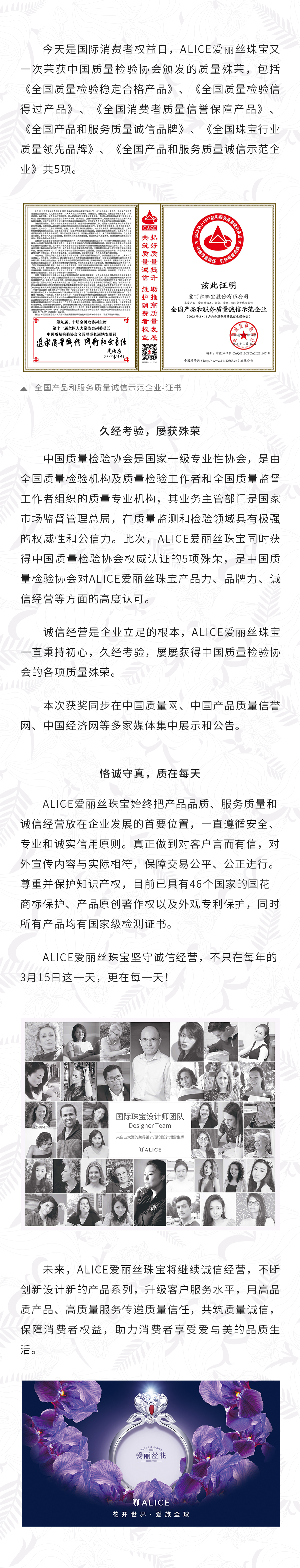 3.15专题 | ALICE爱丽丝珠宝荣获中国质量检验协会五项殊荣